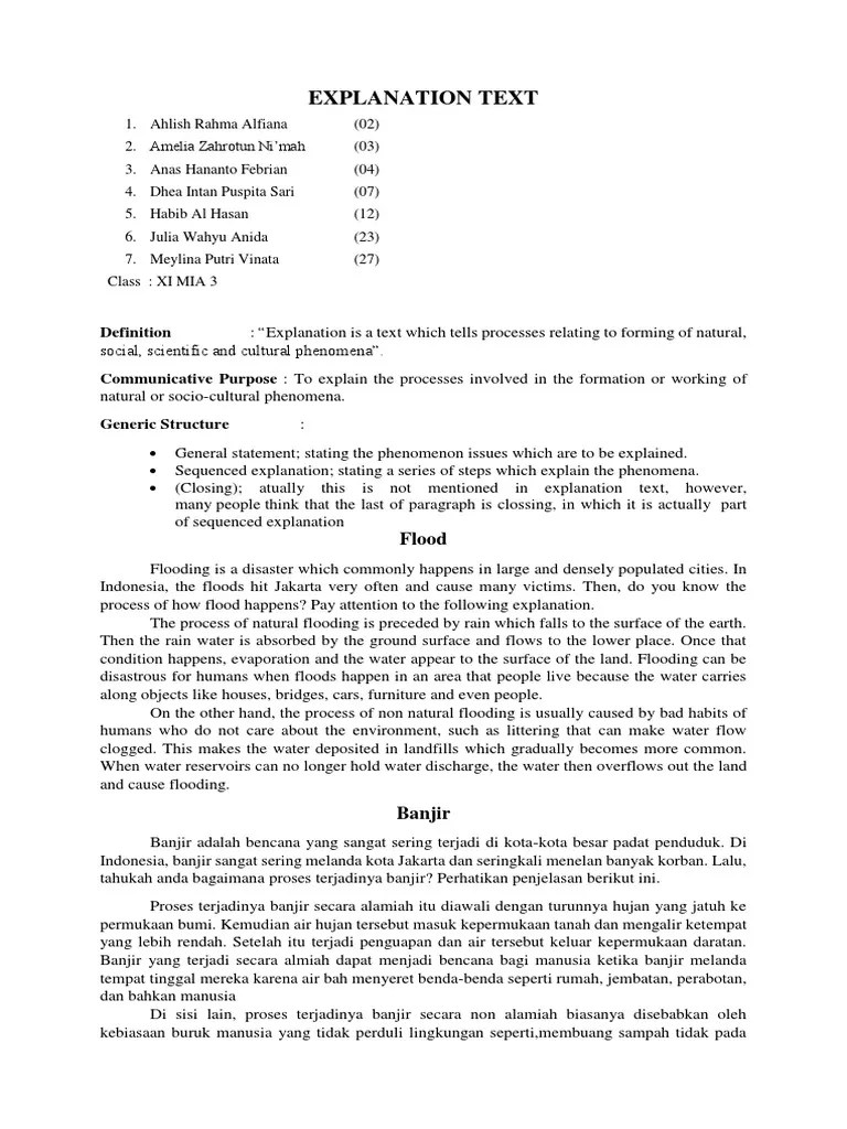 Teks eksplanasi atau explanation text adalah teks yang. Contoh report text tentang banjir terbaru. Hai sahabat kbi, apakah hari ini masih semangat untuk terus belajar bahasa inggris? Explanation text kelas 11 bahasa inggris definition: Lengkap dalam bahasa inggris beserta terjemahannya. Membedakan fungsi sosial, struktur teks, dan unsur kebahasaan beberapa teks explanation lisan dan tulis dengan memberi dan . Banjir adalah limpahan air yang submerges tanah yang biasanya kering. Contoh explanation text tentang banjir dalam bahasa inggris. Explanation text adalah salah satu jenis teks dalam bahasa inggris yang menjelaskan mengenai suatu proses. Contoh explanation text pun banyak macamnya seperti terjadinya pelangi terjadinya banjir terjadinya hujan dan lain sebagainya. Pada kesempatan kali ini, admin ingin memberikan suatu . Generic structure eexlanation text adalah: Dalam bahasa inggris, teks eksplanasi disebut dengan explanation text.